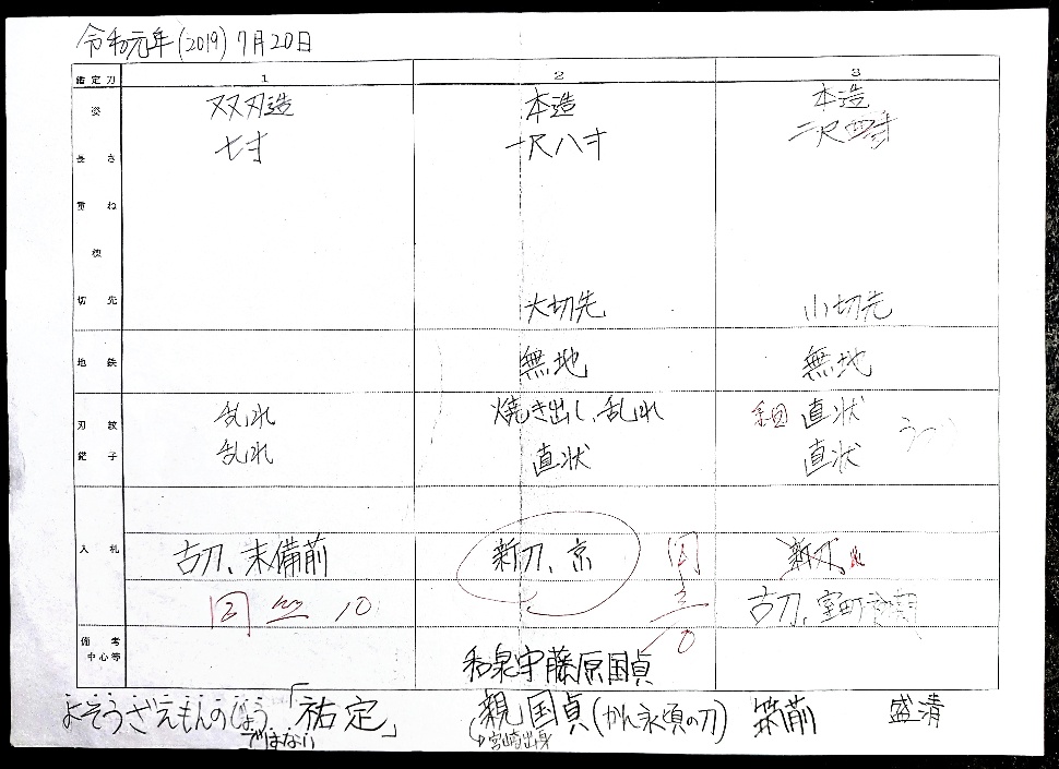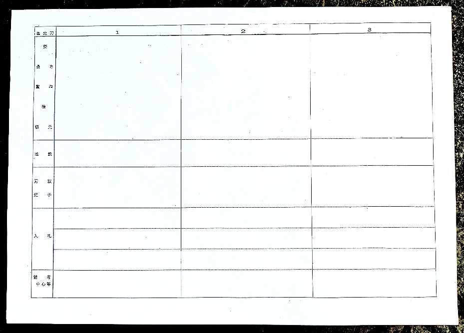 観察したら、この入札用紙に一号刀・二号刀・三号刀の「姿」「長さ」「重(かさね)の厚さ」「棟の種類」「切先の種類」「地鉄(じがね)の状態」「刃文の種類」「鋩子(ぼうし)の種類」をそれぞれ記入します。